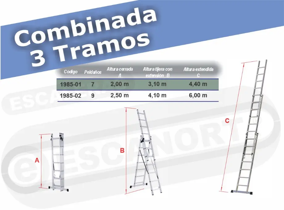 Escalera combinada 3 hojas alum. 120kg 9+9+9=2,52-4,10-6,00m
