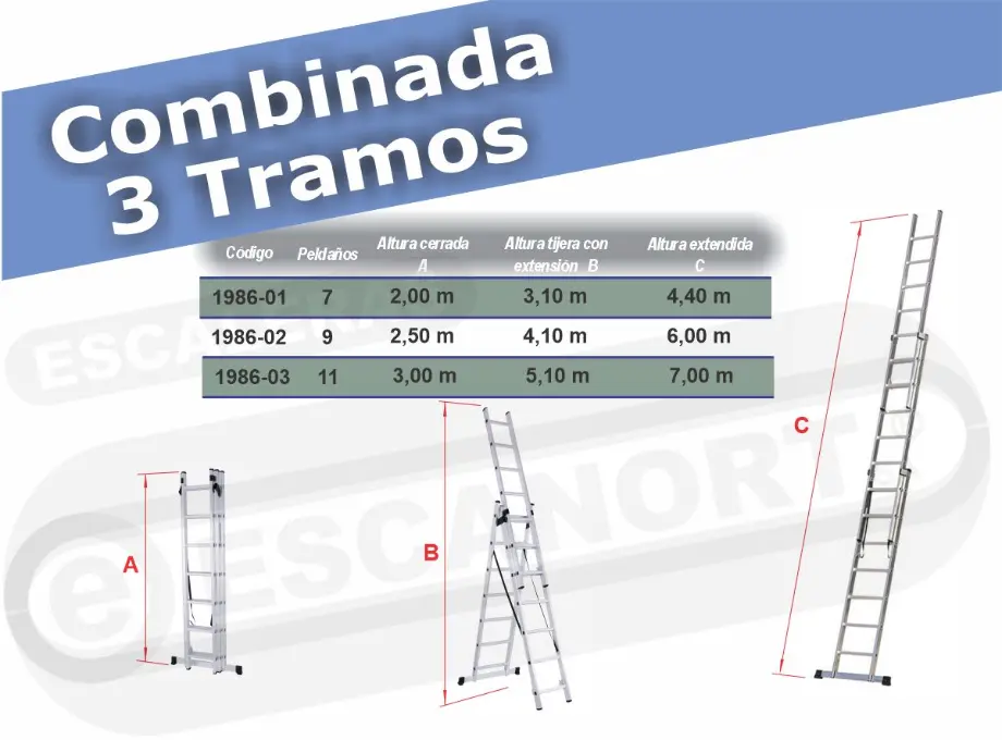 Escalera combinada 3 hojas alum. 136kg 11+11+11=3,20-5,60-7,80m